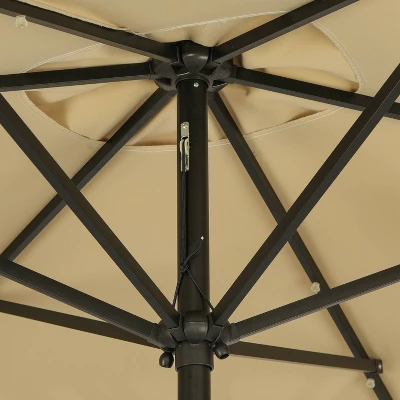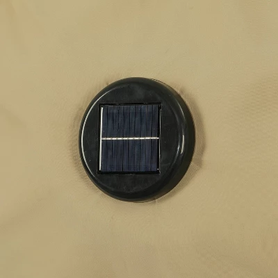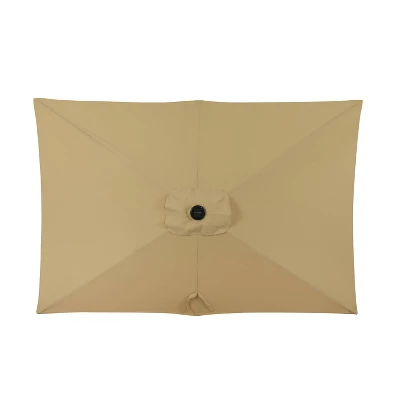 The Nassau 6.5-ft x 10-ft Rectangular Market Umbrella provides a smart and stylish way to shade your patio all summer long. Powered by solar energy, the 32 LED bulb lights will run for up to 4 hours when fully charged. This umbrella is designed for easy operation. Simply turn the crank handle until the canopy is completely open. The durable anodized-aluminum, rust-resistant pole with the convenient push-to-tilt feature has a rich bronze-colored finish. The 6-rib canopy, covered in weather and fade-resistant Breez-Texâ„¢ fabric, sports a single wind vent that allows air to escape freely and limits wind damage. The Nassau Market Umbrella is backed with a 3-year Breez-Texâ„¢ canopy warranty and a 1-year warranty on the pole and structure. Base sold separately.