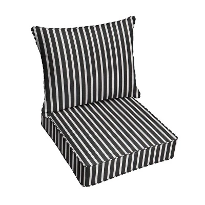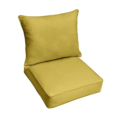 Turn your outdoor gathering space into a welcoming oasis when you finish your patio set with a Corded Outdoor Deep Seat Pillow and Cushion Set from Sunbrella. Featuring durable weather- and fade-resistant fabric that stands up to the elements and keeps your cushions looking great, this two-piece set includes a generously stuffed seat cushion and a coordinating pillow for added comfort on the backrest. Corded seams give the pieces a polished finish. Choose from a variety of colors and patterns to create an appealing outdoor look that suits your fancy. Sunbrella is a 100% acrylic fabric that is water resistant, spill resistant, and fade resistant. Ideal for outdoor use, Sunbrella fabric is UV treated for high-quality fade resistance.
