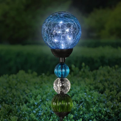 Illuminating solar blue crackle glass ball stake adds a decorative touch to your garden day and night. As the sun sets and dusk settles in, your beautiful glass stake glows from within. The colorful beaded details add an extra touch of elegance. Makes a thoughtful gift and a wonderful addition to any landscape.
