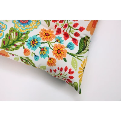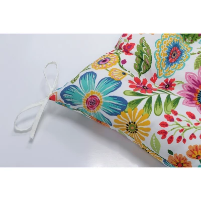 The flower garden print of this set of two outdoor tufted chair cushions brings a new look to your patio decor. Inspired by a painterly Scandinavian print, flowers dance across the fabric in bright shades of pink, orange, turquoise, yellow and green. Additional features of these outdoor tufted chair cushions include 14″ ties and recycled polyester fiber fill with sewn seam closures. Also suitable for indoor use.
