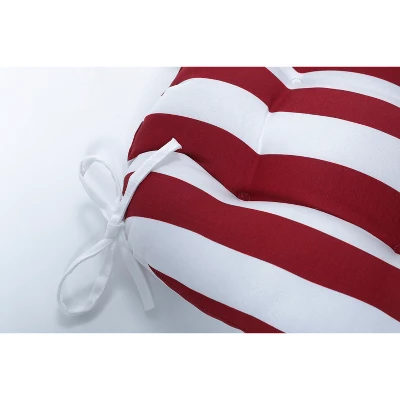 This set of two large outdoor tufted chair pads features a classic cabana stripe. Printed in red and white, the two-inch wide stripes give this pattern a casual feel for any outdoor decor. Additional features of these large outdoor tufted chair pads include 14″ ties to secure the cushions to your furniture and recycled polyester fiber fill with sewn seam closures. Also suitable for indoor use in kitchen and dining areas.
