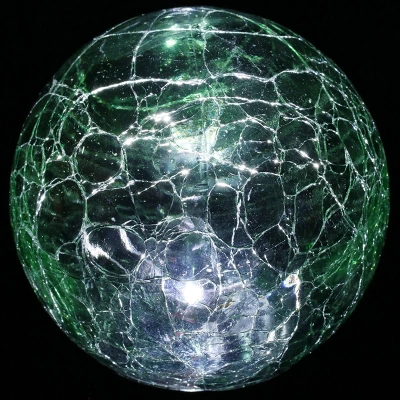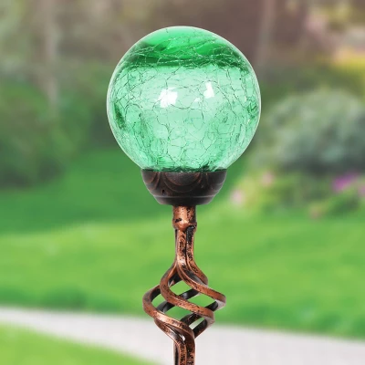 Exquisite illuminating solar green crackle glass ball stake adds a decorative touch to your garden day and night. As the sun sets and dusk settles in, your beautiful glass stake glows from within. The spiraling metal finial adds an extra touch of elegance. Makes a thoughtful gift and a wonderful addition to any landscape.