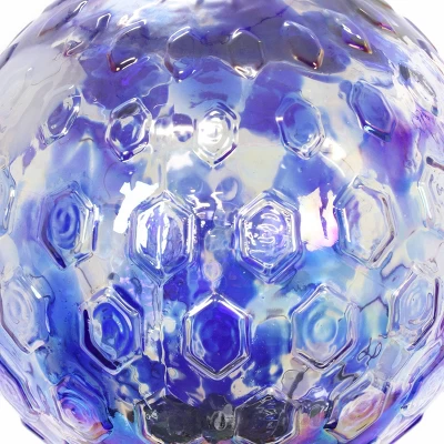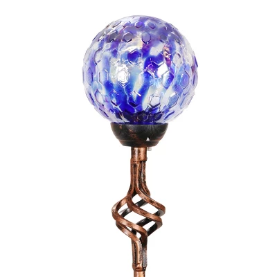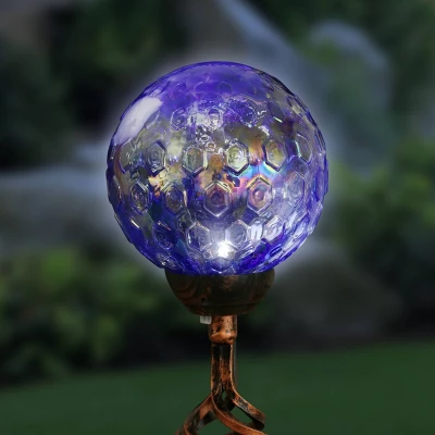 Exquisite Dark Blue Solar Pearlized Honeycomb Glass Stake illuminates adding gorgeous color and life to your garden day and night. As the sun sets and dusk settles in, watch your beautiful glass stake glow from within. The spiraling metal finial adds and extra touch of elegance. Makes a thoughtful gift and a wonderful addition to any landscape. Exhart hand blown glass pieces are one-of-a-kind and present with slight color variations.