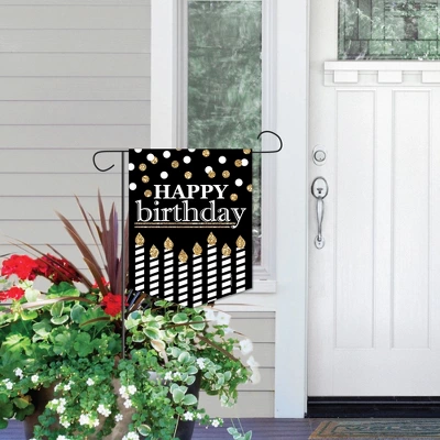 Adult Happy Birthday Garden Flag INCLUDES 1 polyester fabric material garden flag in a vertical pennant shape that measures 12 inches wide and 15.25 inches tall. (Flagpole Not Included) Cute Decor: Welcome houseguests with this weather resistant Black and Gold Happy Birthday Garden Flag. Printed double-sided, Adult Happy Birthday – Birthday Party Decor Garden Flag looks great placed close to your home, added to flowerpots, or displayed next to your favorite garden gnome decoration. Yard & Home: Adult Happy Birthday Garden Flag is machine washable and fade-resistant, allowing you to easily display in your outdoor lawn or inside your home for a fun Birthday Party decoration. The small and cute size helps make this a great housewarming gift for a loved one’s deck, patio, porch, or yard. High-Quality Supply: Adult Happy Birthday Garden Flag is professionally printed double-sided on 100% polyester material. With a 1.625-inch flagpole opening, easily & quickly display the vibrant Black and Gold Happy Birthday Garden Flag. Please Note: Flagpole Not Included – will fit most standard-sized garden flag stand flagpoles. Printed In The USA: Adult Happy Birthday outdoor lawn and home Garden Flag is designed and manufactured at our Wisconsin facility using materials that are Printed in the USA – Fabric Flag Made in China. Adult Happy Birthday Garden Flag uses a No-Mess Glitter Print: Our Garden Flag is designed with a printed image of glitter, eliminating glitter flake while maximizing bling effect!