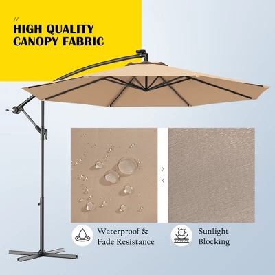 This Is Our 10ft Hanging Offset Umbrella, Sun Tent, Rain Shelter, And More All In One, The Parasol Gives You Instant Portable Protection From The Elements Regardless Of Your Activity. The Beach Umbrella Sets Up In Just Three Seconds. As A Result, You Do not Have To Deal With Finicky Stakes Or Willowy Tarps Should A Rainstorm Roll In Without Notice. Just Pop Open The Umbrella And Ground Stakes For Extra Stability. What is more, in the night, 24 Pre-Installed Solar-Powered LEDs lights will light up and decorate your summer night. Add A New Partner To Make You Happy Journey, Just Take It Home !