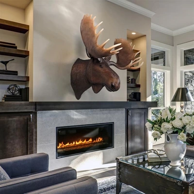Moose are the largest North American deer unmistakably recognized by their gigantic sprawling palmate (meaning hand shaped) antlers. These huge, powerful and peaceful animals are highly protective of their offspring and their family. The majestic moose lives in the forests but can also be found grazing in grasslands and along rivers and lakes. Toscano’s big bull moose wall trophy was sculpted as a beautiful piece of faux taxidermy cast in quality designer resin and hand-painted to capture the moose’s giant antlers, muzzle-like face, and beard” of skin which hangs under their necks and then finished in the realistic tones of nature. Our exclusive display-quality large scale North American Majestic Moose wall sculpture transforms any home garden restaurant or hotel into something truly magnificent! Best of all it doesn’t require you to be a great marksman with anything more than your credit card! Mounting hardware included. Simple assembly required