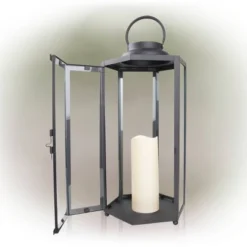 18″ Hexagonal Candlelit Iron Lantern With LED Lights Black/Warm White – Alpine Corporation