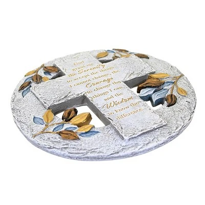 Make A Meaningful Statement With This Unique Serenity Stepping Stone/Wall Plaque. The Raised Cross Features An Inspirational Quote, While The Round Open Stepping Stone Can Be Used Outdoors Or Indoors As Decoration. In Just One Simple Piece, Enhance Your Space With A Beautiful Reminder Of Peace And Courage. On The Circular Stone Area Re Gold And Green Leaves.. New. Comes Packaged In A Box.. Measurements 9.5 In H X 9.5 In W X 5.5 In D. . No Assembly Required. Outdoor Use Only. Imported