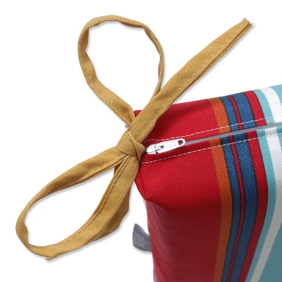 Give your patio a lively, festival-like style with the flattering awning stripes of this set of two outdoor oversized seat cushions. Ideal for brightening dark areas, their uneven striped pattern is in hot shades of red, yellow, green and blue. Made of 100% polyester fade-resistant fabric. Additional features of these outdoor oversized seat cushions include square corners, 14″ ties and recycled polyester fill with zippered closures for easy removal. Also suitable for indoor use.