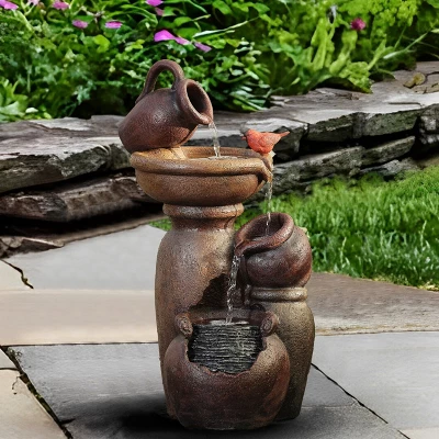 Create a calming and comfortable space with this lovely water fountain. Ideal , the fountain will add a decorative touch and is a perfect accent for any garden or patio. A steady stream of water flows from the pitcher to the urns and pots below, creating soothing and relaxing sounds. The birdbath bowl sits atop a tall urn with a sweet red cardinal perched on the side. This fountain includes the electric submersible pump for setup. In addition, this fountain’s durable poly resin construction is weather resistant and easy to maintain.