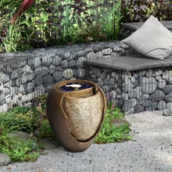 Teamson Home Outdoor 22 Inch Water Fountain Pot With Fire Pit And Fire Glass, Brown