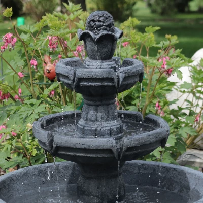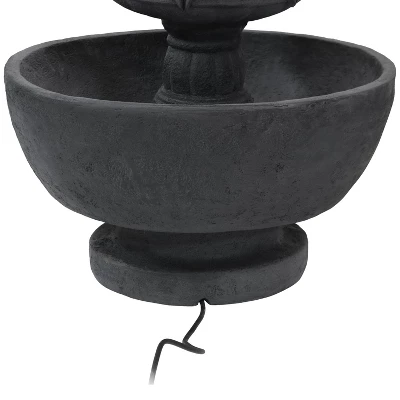 Add elegant appeal to any lawn or garden with this tiered outdoor water fountain featuring 3 tiers and a budding design motif. Great for a patio, this water feature provides a decorative Old-World touch with its stone-like appearance and traditional, large basin bowl. Relax on a summer day and listen to the water as it streams down the decorative finial down the tiers below in multiple, subtle, elegant streams. Constructed of durable and lightweight polyresin, this fountain has the look of stone but is easy to clean, maintain, and place anywhere. The finial features beautiful shapes of delectable fruit. Setup is easy, with the included submersible electric JR-450 pump that stays quiet so that the waterfall sounds can expand. Place in your yard, garden, or other landscaping to fully immerse this beauty in your home and outdoor space. Simply place in your ideal location, fill the bottom basin with water, plug in to the nearest electrical outlet, and watch your space transform with a beautiful focal point and soothing soundscapes.