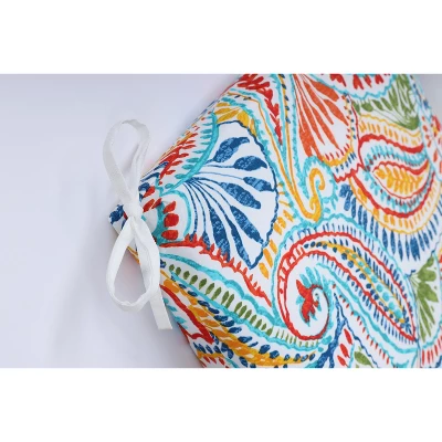 Give your patio or porch an intense splash of color with the hot paisley fabric pattern of this stylish outdoor chaise lounge cushion. Its bold print design is set on a white ground in bright shades of blue, green, orange, red and yellow, perfect spicing up your outdoor ensemble. Made of 100% polyester fade-resistant fabric. Additional features of this outdoor chaise lounge cushion include 14″ ties to secure the cushion to your furniture, square corners and recycled polyester fill with a sewn seam closure.